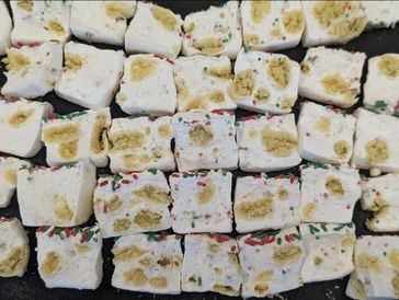 Allergens: Milk, Soy Ingredient List: Sugar, Light Corn Syrup (Light Corn Syrup, Salt, Vanilla), Water, Confectioners’ Sugar (Sugar, Cornstarch), Gelatin, Natural Flavor (Alcohol, Water, Natural flavor & extractives of butter (milk), Natural Flavor (Water, Sugar, Alcohol, Natural Flavors), Artificial Flavor (Water, Sugar, Caramel Color, Citric Acid, Sodium Benzoate), Salt, Soybean Oil, Soy Lecithin