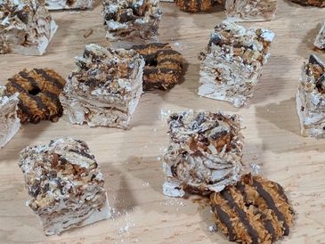Ingredient List: Sugar, Light Corn Syrup (Light Corn Syrup, Salt, Vanilla), Dehydrated Marshmallows (Sugar, Corn Syrup, Modified Cornstarch, Gelatin, Sodium Hexametaphosphate, Artificial Flavor, Natural Flavor, Artificial Color (blue 1), Mini Chocolate Chips (Sugar, Chocolate, Milkfat, Cocoa butter, Soy Lecithin, Na
